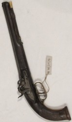 Pistolet kapiszonowy, wykonany przez Jakoba Adama Kuchenreutera, znanego rusznikarza niemieckiego działającego w Bawarii. Kaliber 12mm. Lufa ośmiogranna, inkrustowana srebrem: J. Adam Kuchenreuter i ornament wiciowy. W dennej części lufy srebrny znak wytwórni Kuchenreuterów: je...więcej Pistolet kapiszonowy, wykonany przez Jakoba Adama Kuchenreutera, znanego rusznikarza niemieckiego działającego w Bawarii. Kaliber 12mm. Lufa ośmiogranna, inkrustowana srebrem: J. Adam Kuchenreuter i ornament wiciowy. W dennej części lufy srebrny znak wytwórni Kuchenreuterów: jeździec na koniu z pistoletem w dłoni, dalej wybity znak V. Zamek kapiszonowy, młoteczek z wgłębieniem, kominek z brandką.Umieszczony po prawej stronie broni. Język spustowy z zabezpieczeniem naciągu kurka. Okucia mosiężne wykonane z blachy mosiężnej, wycinanej w formie stylizowanych palmet. Stempel osadzony pod łożem, zakończony nasadką z kości słoniowej. Łoże i kolba jednolicie wykonane z drewna orzechowego, barwionego na ciemny brąz. Rękojeść ozdobiona snycerką w formie kratownicy. Na lufie celownik i muszka. Pistolet od kompletu pojedynkowego, oznaczony jednym mosiężnym ćwieczkiem. |