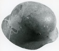 Dzwon wojskowego hełmu armii niemieckiej typ M40 lub M42 z okresu II wojny światowej. Na obwodzie otwory do mocowania wyściółki (nie zachowała się) i dwa wywietrzniki. Cała powierzchnia silnie skorodowana. Brak widocznych symboli i sygnatur, wtórne zabrudzenia farbą. |