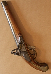 Rosyjski wojskowy pistolet skałkowy. Lufa i zamek stalowe, okucia i panewka mosiężne. Blacha zamkowa sygnowana po rosyjsku TUŁA 1814. Na grzbiecie lufy nieczytelna sygnatura. Na mosiężnej kontrblasze sygnatura ACz, na osłonie spustu TF. Na grzbiecie rękojeści owalna mosiężna...więcej Rosyjski wojskowy pistolet skałkowy. Lufa i zamek stalowe, okucia i panewka mosiężne. Blacha zamkowa sygnowana po rosyjsku TUŁA 1814. Na grzbiecie lufy nieczytelna sygnatura. Na mosiężnej kontrblasze sygnatura ACz, na osłonie spustu TF. Na grzbiecie rękojeści owalna mosiężna plakietka z monogramem cara Aleksandra I: ukoronowana, stylizowana litera A. Kaliber 17mm. Elementy drewniane prawdopodobnie dorabiane. |