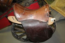 Polskie siodło kawaleryjskie wz. 34. Stelaż drewniany, obciągnięty skórą. Na siodle wytłoczona nazwa producenta PZ PATiR Warszawa. |
