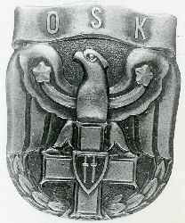 Odznaka absolwenta Oficerskiej Szkoły Kwatermistrzów. Kształt stylizowanej tarczy. Pośrodku polski orzeł oparty szponami na Krzyżu Grunwaldu i wieńcu laurowym. Nad orłem wstęga z literami OSK Na odwrocie gwintowany trzpień mosiężny z nakrętką barwioną na kolor złoty . N...więcej Odznaka absolwenta Oficerskiej Szkoły Kwatermistrzów. Kształt stylizowanej tarczy. Pośrodku polski orzeł oparty szponami na Krzyżu Grunwaldu i wieńcu laurowym. Nad orłem wstęga z literami OSK Na odwrocie gwintowany trzpień mosiężny z nakrętką barwioną na kolor złoty . Na nakrętce tłoczony napis: ZAKŁADY PRZEMYSŁOWE POD ZARZĄDEM PAŃSTW. B. GRABSKI ŁÓDŹ |