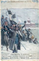 Niemiecka kartka pocztowa przedstawiająca przekroczenie Renu przez armię Blichera w 1814r. Na odwrocie zapisana w języku niemieckim. |