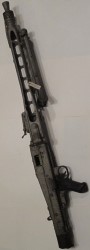 Ręczny karabin maszynowy MG42, kal.7,92. Broń z głębokimi wżerami pokorozyjnymi, brak lufy. Numer broni słabo czytelny. Na częściowo zachowanej stopce kolby wykonanej z tworzywa widoczny numer :12164, niżej mała litera "a". Okładziny rękojeści z czarnego bakelitu. |