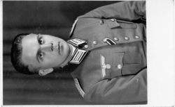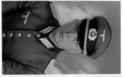 (oficer piechoty). Nad prawą górną kieszenią munduru godło niemieckie, nad lewą kieszenią przypięty prostokątny znaczek (niezidentyfikowany). Przy zapięciu munduru ukośnie zamocowania wstęga ( prawdopodobnie krzyża żelaznego).