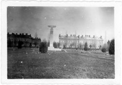 fotografia przedstawia widok na koszary zamojskie. Na pierwszym planie widoczny obelisk pozostały po usuniętym pomniku Józefa Piłsudskiego, na nim niemiecki orzeł. Należy przypuszczać, że fotografia