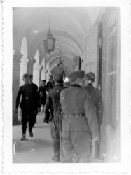 fotografia w tonacji czarno- białej.Przedstawia widok na fragment zamojskiej starówki (podcienia).Na pierwszym planie widać spacerujących żołnierzy niemieckich, w głębi osoby cywilne.