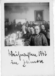 fotografia w tonacji czarno - biaÅ‚ej.Przedstawia grupÄ™ oficerów niemieckich siedzÄ…cych za zastawionym stoÅ‚em. Prawdopodobnie jest to przyjÄ™cie bożonarodzeniowe ( w tle trzy przebrane postacie: anioÅ‚ek, Å›w. MikoÅ‚aj, diabeÅ‚). Na Å›cianie widoczny portret H. Goeringa. Pod zdjÄ...wiÄ™cej fotografia w tonacji czarno - biaÅ‚ej.Przedstawia grupÄ™ oficerów niemieckich siedzÄ…cych za zastawionym stoÅ‚em. Prawdopodobnie jest to przyjÄ™cie bożonarodzeniowe ( w tle trzy przebrane postacie: anioÅ‚ek, Å›w. MikoÅ‚aj, diabeÅ‚). Na Å›cianie widoczny portret H. Goeringa. Pod zdjÄ™ciem odrÄ™czny podpis atramentem w jÄ™zyku niemieckim ( pismo niewyraźne):