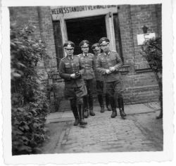 fotografia w tonacji czarno - białej, przedstawia czterech niemieckich oficerów wehrmachtu, pozujących do fotografii na tle budynku ( prawdopodobnie jest to jeden z budynków koszarowych w Zamościu). Nad oknem budynku niemiecki szyld : "HEERESSSTANDDORT