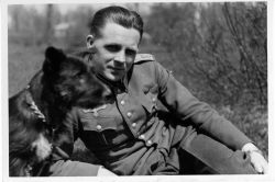 fotografia : niemiecki oficer pozujący z młodą kobietą i psem |