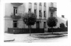 fotografia przedstawia fasadę budynku w Zamościu przy ul.Piłsudskiego 31(budynek istnieje do dziś). Nad drzwiami wejściowymi szyld w języku niemieckim: