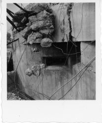fotografia w tonacji czarno - białej. Przedstawia uszkodzone konstrukcje żeelbetowe. Na odwrocie fotografii adnotacja czarnym atramentem po niemiecku