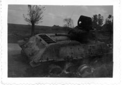 Na odwrocie adnotacja odręczna w języku niemieckim wykonana czarnym atramentem: "Russischer Panzer im Strafenraben" (rosyjski czołg w przydrożnym rowie".Fotografia wykonana na firmowym papierze Agfa -Lupex. |