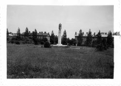 Fotografia w tonacji czarno - białej. Przedstawia widok na pomnik J. Piłsudskiego, na terenie koszar w Zamościu. W tle budynki koszarowe ( w czasie II wojny siedziba administracji niemieckiej. Z prawej strony fotografii, na marginesie czarnym kolorem, odręcznie wykonana strzałka w...więcej Fotografia w tonacji czarno - białej. Przedstawia widok na pomnik J. Piłsudskiego, na terenie koszar w Zamościu. W tle budynki koszarowe ( w czasie II wojny siedziba administracji niemieckiej. Z prawej strony fotografii, na marginesie czarnym kolorem, odręcznie wykonana strzałka wskazująca najbliższy budynek (prawdopodobnie ten, w którym znajdowało się mieszkanie służbowe niemieckiego oficera (właściciela zdjęć?, por. inne z tej serii). Na odwrocie fotografii adnotacja odręczna, wykonana czarnym atramentem w języku niemieckim (park z pomnikiem Piłsudskiego przy budynku administracji).