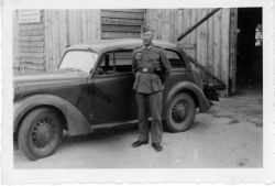 fotografia w tonacji czarno - białej. Przedstawia żołnierza w niemieckim mundurze, stojącego na obok samochodu osobowego (prawdopodobnie Opel). Na odwrocie fotografii odręczny podpis czarnym atramentem, po niemiecku : "Meine fahrer Meyer Juli'42" ( mój kierowca Meyer, lipiec '42)...więcej fotografia w tonacji czarno - białej. Przedstawia żołnierza w niemieckim mundurze, stojącego na obok samochodu osobowego (prawdopodobnie Opel). Na odwrocie fotografii odręczny podpis czarnym atramentem, po niemiecku : "Meine fahrer Meyer Juli'42" ( mój kierowca Meyer, lipiec '42). |
