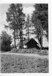 czarnym atramentem w języku ni...więcej Fotografia w tonacji czarno - białej.Przedstawia fragment pejzażu wiejskiego.Na pierwszym planie, w otoczeniu sosen wiejska chata, z lewej strony widoczny fragment drewnianego parkanu sąsiednich zabudowań. Na odwrocie fotografii odręczna adnotacja