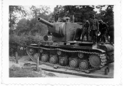 Na odwrocie fotografii, odręcznym pismem, czarnym atramentem adnotacja: "Russchiser Tank mit 15 cm Geschutz" (rosyjski czołg z działem 15 cm).Zdjecie na papierz...więcej Fotografia w tonacji czarno - białej. Przedstawia sowiecki czołg KW - 2 stojących na nim niemieckich żołnierzy (7).