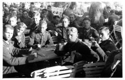 Na odwrocie fotografii ołowkiem : 468/23 i odbity ziel...więcej Fotografia w tonacji czarno - białej, format pocztówki. Przedstawia grupę niemieckich żołnierzy (plutonowy i szeregowi) w czasie posiłku. Posiłek na świeżym powietrzu. Brak danych pozwalających zidentyfikować miejsce.