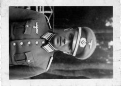 fotografia w tonacji czarno - białej. Przedstawia niemieckego oficera ( popiersie) w mundurze. W tle widoczne ogrodzenie (?) i pnie drzew. Na odwrocie słabo czytelna pieczęć zakładu fotograficznego :