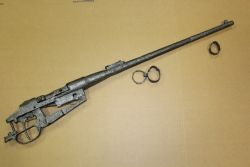II. Bat...więcej Skrócona wersja karabinu Mausera wz. 1898. Silnie skorodowany i ze zniszczonym łożem (karabin i łoże nie są kompletem). Na komorze zamkowej słabo widoczne oznaczenie Erfurt 1916. Na stopce kolby wybite oznaczenia pułkowe: 9.A.F II.1 M 20 ( Fußartillerie-Regiment Nr. 9