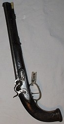 Pistolet kapiszonowy, pojedynkowy, od kompletu. Wykonany przez Jakoba Adama Kuchenreutera, rusznikarza niemieckiego działającego w Bawarii. Kaliber 12mm. Lufa ośmiogranna, inkrustowana srebrem: J: Adam Kuchenreuter w ornamencie wiciowym. Na dennej części lufy srebrny znak wytwórn...więcej Pistolet kapiszonowy, pojedynkowy, od kompletu. Wykonany przez Jakoba Adama Kuchenreutera, rusznikarza niemieckiego działającego w Bawarii. Kaliber 12mm. Lufa ośmiogranna, inkrustowana srebrem: J: Adam Kuchenreuter w ornamencie wiciowym. Na dennej części lufy srebrny znak wytwórni Kuchenreuterów: jeździec na koniu z pistoletem w dłoni. Niżej znak jakości V. Zamek kapiszonowy z kominkiem i wgłębieniem w młoteczku, umieszczony z prawej strony broni. Język spustowy z zabezpieczeniem naciągu kurka. Osłona spustu mosiężna z oparciem na palec. Okucia z blachy mosiężnej. Pod łożem stempel z główką z kości słoniowej. Łoże i rękojeść wykonane jednolicie z drewna orzechowego, barwionego na ciemny brąz. Rękojeść ze snycerką w kratownicę. Pistolet oznaczony jako drugi od kompletu przez 2 ćwieczki mosiężne na górnej części rękojeści. |