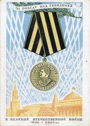Karta pocztowa radziecka z okresu II Wojny Światowej. Przedstawia rysunek medalu "Za zwycięstwo nad Niemcami w Wielkiej Wojnie Ojczyźnianej 1941?1945" na tle Placu Czerwonego, na górze i dole karty widoczna nazwa medalu zapisana cyrylicą. |