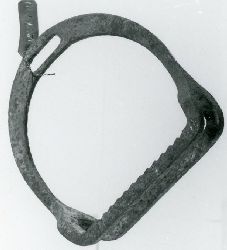 Strzemię kawaleryjskie, stalowe. Stopka podwójna karbowana, kabłąk płaski z prostokątnym otworem szerokości 22mm. Całość skorodowana, brak widocznych symboli i sygnatur. |
