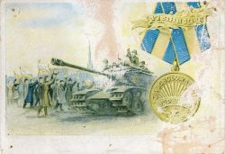 Karta pocztowa radziecka przedstawiająca wkroczenie wojsk radzieckich do Warszawy 17 stycznia 1945 r. Z prawej strony czołgu widoczny radziecki medal "Za wyzwolenie Warszawy" . |