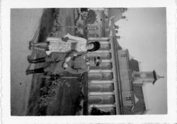 Fotografia w tonacji czarno - białej, w odcieniu sepii. Na fotografii na pierwszym planie niemiecki oficer, obok młoda kobieta, trzymająca go pod rękę. Pozują do fotografii na tle budynku ( pałacu? Za nimi widoczny szeroki trawnik i fragmenty zabudowań z wieżyczkami. Trudno ok...więcej Fotografia w tonacji czarno - białej, w odcieniu sepii. Na fotografii na pierwszym planie niemiecki oficer, obok młoda kobieta, trzymająca go pod rękę. Pozują do fotografii na tle budynku ( pałacu? Za nimi widoczny szeroki trawnik i fragmenty zabudowań z wieżyczkami. Trudno określić miejsce (prawdopodobnie jakiś zespół pałacowy w Niemczech).