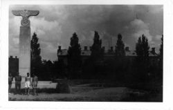 Fotografia w tonacji czarno - białej, w odcieniu sepii. Przedstawia obelisk w koszarach w Zamościu, który pozostał po zburzeniu przez Niemców pomnika J. Piłsudskiego ( w sierpniu 1942 r.) i umieszczeniu na nim niemieckiego orła. Przed pomnikiem stoją czterej mężczyźni (ofic...więcej Fotografia w tonacji czarno - białej, w odcieniu sepii. Przedstawia obelisk w koszarach w Zamościu, który pozostał po zburzeniu przez Niemców pomnika J. Piłsudskiego ( w sierpniu 1942 r.) i umieszczeniu na nim niemieckiego orła. Przed pomnikiem stoją czterej mężczyźni (oficer niemiecki w mundurze i trzej mężczyźni w strojach plażowych). W tle słabo widoczne za drzewami budynki koszarowe. |