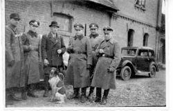 Fotografia w tonacji czarno - białej,odcień sepii, o wymiarach 6x9 cm. Przedstawia grupę 6 mężczyzn. Czterej z nich to niemieccy oficerowie w płaszczach,trzej z nich mają przewieszoną przez ramię długą broń.Pośrodku starszy mężczyzna w cywilnym ubraniu ( strój myśliwsk...więcej Fotografia w tonacji czarno - białej,odcień sepii, o wymiarach 6x9 cm. Przedstawia grupę 6 mężczyzn. Czterej z nich to niemieccy oficerowie w płaszczach,trzej z nich mają przewieszoną przez ramię długą broń.Pośrodku starszy mężczyzna w cywilnym ubraniu ( strój myśliwski), trzymający na smyczy myśliwskiego psa. Fotografia zrobiona na tle okazałego budynku z cegły. Z prawej strony na fotografii widoczny samochód osobowy ( czarny mercedes?). |
