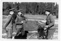 Fotografia w tonacji czarno - białej, w odcieniu sepii. Przedstawia 3 oficerów niemieckich w plenerze, rozmawiających z sobą. Zdjęcie pokazuje ich z profilu. Oficer z prawej strony fotografii trzyma rower.Oficer z lewej strony fotografii to prawdopodobny właściciel zdjęć (wyst...więcej Fotografia w tonacji czarno - białej, w odcieniu sepii. Przedstawia 3 oficerów niemieckich w plenerze, rozmawiających z sobą. Zdjęcie pokazuje ich z profilu. Oficer z prawej strony fotografii trzyma rower.Oficer z lewej strony fotografii to prawdopodobny właściciel zdjęć (występuje na większości fotografii z cyklu pod nr ks. wpływu 1519.Teren to bezdroża w tle niewielki lasek. |