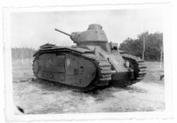 Fotografia czarno - biała w odcieniu sepii, o wymiarach 6x9, na błyszczącym papierze fotograficznym. Przedstawia francuski czołg CHAR B(1), w niemieckich oznakowaniach.( Po zajęciu Francji w 1940 r. Niemcy wyposażyli własne nowo utworzone dywizje pancerne w czołgi CHAR B, wykor...więcej Fotografia czarno - biała w odcieniu sepii, o wymiarach 6x9, na błyszczącym papierze fotograficznym. Przedstawia francuski czołg CHAR B(1), w niemieckich oznakowaniach.( Po zajęciu Francji w 1940 r. Niemcy wyposażyli własne nowo utworzone dywizje pancerne w czołgi CHAR B, wykorzystując je do inwazji na ZSRS w czerwcu 1941) Fotografia przedstawia czołg na otwartym terenie, w tle zagajnik i las..Fotografia wykonana prawdopodobnie latem 1941 r. na froncie wschodnim. |