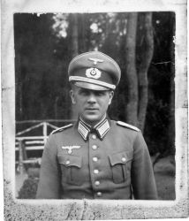 Fotografia czarno - biała, w odcieniu sepii.Format portretowy. Przedstawia niemieckiego oficera, w mundurze i czapce.Na kołnierzu patki oficerskie, na lewej piersi, powyżej kieszeni niemiecki orzeł Wehrmachtu. Oznaka stopnia na naramiennikach nieczytelna.Oficer to prawdopodobnie w...więcej Fotografia czarno - biała, w odcieniu sepii.Format portretowy. Przedstawia niemieckiego oficera, w mundurze i czapce.Na kołnierzu patki oficerskie, na lewej piersi, powyżej kieszeni niemiecki orzeł Wehrmachtu. Oznaka stopnia na naramiennikach nieczytelna.Oficer to prawdopodobnie właściciel zestawu fotografii ( nr ks. wpływu 1519), występuje na większości fotografii. Oficer pozuje w plenerze, w tle wysokie drzewa i fragmenty drewnianego zagrodzenia Fotografia o rzeczywistych wymiarach 8,2 x 7 naklejona na podkładkę papierową, tworzącą marginesy zewnętrzne 7mm na dłuższych brzegach i 10 mm na krótszych. |