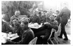 Fotografia w formacie pocztówki, czarno - biała, w odcieniu sepii.Przedstawia grupę żołnierzy niemieckich siedzących na świeżym powietrzu, w otoczeniu drzew ( być może teren koszar?), pzy stolikach, podczas posiłku.Trudno określić miejsce i okoliczności.Wśród żołnier...więcej Fotografia w formacie pocztówki, czarno - biała, w odcieniu sepii.Przedstawia grupę żołnierzy niemieckich siedzących na świeżym powietrzu, w otoczeniu drzew ( być może teren koszar?), pzy stolikach, podczas posiłku.Trudno określić miejsce i okoliczności.Wśród żołnierzy są szeregowi i podoficerowie. |