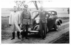 Fotografia w tonacji czarno - białej, w lekkiej sepii, wykonana w plenerze. Teren nieokreślony ( jakaś bita droga, w tle pola. Przedstawia niiemieckiego oficera Wehrmachtu w towarzystwie dwóch mężczyzn po cywilnemu. Stoją na tle czarnego samochodu osobowego ( prawdopodobnie słu...więcej Fotografia w tonacji czarno - białej, w lekkiej sepii, wykonana w plenerze. Teren nieokreślony ( jakaś bita droga, w tle pola. Przedstawia niiemieckiego oficera Wehrmachtu w towarzystwie dwóch mężczyzn po cywilnemu. Stoją na tle czarnego samochodu osobowego ( prawdopodobnie służbowy mercedes?). Mężczyzna z prawej strony fotografii oparty ręką o maskę samochodu. Widoczna końcówka numeru rejestracyjnego samochodu ...29. |