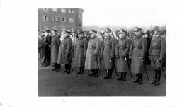 Fotografia w tonacji czarno - białej,w formacie pocztówki (z miejscem na korespondencję). Przedstawia na pierwszym planie niemieckich oficerów , w tyle widoczni żołnierz w hełmach i cywile ( kobiety i mężczyźni). Trudno określić dokładnie miejsce i charakter uroczystości....więcej Fotografia w tonacji czarno - białej,w formacie pocztówki (z miejscem na korespondencję). Przedstawia na pierwszym planie niemieckich oficerów , w tyle widoczni żołnierz w hełmach i cywile ( kobiety i mężczyźni). Trudno określić dokładnie miejsce i charakter uroczystości. Z lewej strony fotografii wysoki, dwupiętrowy budynek ( koszary ?).W pierwszym szeregu trzeci z prawej to oficer występujący na większości fotografii z tego ceklu (nr ks. wpływu 1519)