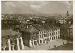 Kartka pocztowa z widokiem płd- wsch części zamojskiego Rynku Wielkiego. W tle widać były kościół Franciszkanów i Dom Centralny. Na odwrocie opis: Zamość. Widok z wieży ratuszowej na miasto. Fot. prof. A. Lenkiewicz. |