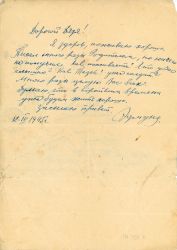 List Edmunda Sadowskiego do rodziny,służącego w Armii Czerwonej( 3 Front Ukraiński 57 Armia). List pisany w języku rosyjskim, pismo odręczne czarnym atramentem.Datowany: 25 III 1945 r.Na odwrocie oprócz nazwiska i adresu adresata także adres nadawcy (po rosyjsku: Sadowskij Edm...więcej List Edmunda Sadowskiego do rodziny,służącego w Armii Czerwonej( 3 Front Ukraiński 57 Armia). List pisany w języku rosyjskim, pismo odręczne czarnym atramentem.Datowany: 25 III 1945 r.Na odwrocie oprócz nazwiska i adresu adresata także adres nadawcy (po rosyjsku: Sadowskij Edmund Josifowicz poczta polowa 17922A.Obok pieczęcie poczty polowej CCCP 27 3 45., pieczęć w jęz. polskim:sprawdzono przez cenzurą wojskową 1058. i pieczęć okrągła UP w Krasnymstawie. |