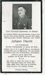 Nekrolog niemieckiego Obergefreitra o nazwisku Johann Hecht, urodzonego 08. 04. 1910 r., a zmarłego 20 lipca 1944 r. w Zamościu.Po jednej stronie jego fotografia i krótka notka, na odwrocie pieta i modlitwa. |
