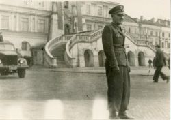 Oficer lotnictwa LWP i wykładowca TSWL Eugeniusz Baranowski przed ratuszem w Zamościu.Lata 50- 60. XX w. |