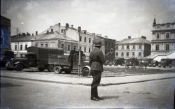 Negatyw czarno- białej fotografii przedstawiającej niemieckiego żandarma wojskowego kierującego ruchem na Rynku Wielkim w Zamościu. W tle widoczne zaparkowane samochody, oraz część Ratusza i kamienice przy zach. pierzei rynku.