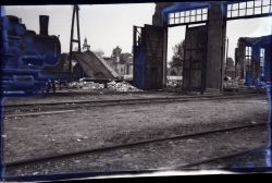 Negatyw czarno- białej fotografii przedstawiającej zniszczone budynki zajezdni kolejowej w Zamościu i parowóz. W tle widoczna kopuła dzwonnicy przy zamojskiej Kolegiacie.