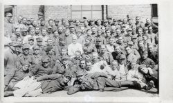Negatyw fotografii. Grupa żołnierzy II RP na tle ceglanego budynku. W większości piechota, dwaj mają na głowach berety wojsk zmechanizowanych. Zdjęcie wykonane zapewne na początku wojny w obozie jenieckim lub internowania?