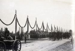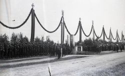 Negatyw fotografii. Wizyta marszałka Rydza Śmigłego w Zamościu w lipcu 1938 roku. Defilada na lotnisku w Mokrem. Widoczna trybuna honorowa i początek kolumny wojska. Na koniu prawdopodobnie dowódca 9 Pułku Piechoty Legionów płk. Stanisław Sosabowski. |