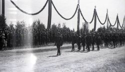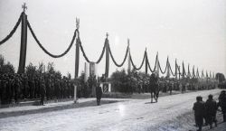 Negatyw fotografii z wizyty marszałka Rydza- Śmigłego w Zamościu. Defilada wojskowa na lotnisku w Mokrym. Widoczna trybuna i przemarsz wojska. |