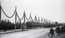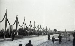 Negatyw fotografii. Wizyta marszałka Rydza Śmigłego w Zamościu w lipcu 1938 roku. Początek defilady na lotnisku w Mokrem. Widoczna trybuna honorowa i w oddali początek kolumny wojska. |