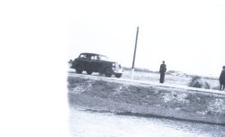 Negatyw fotografii z serii z wizyty marszałka Rydza Śmigłego w Zamościu. Przygotowania do defilady na lotnisku w Mokrem. Widoczny samochód marki Opel z nadjeżdżającymi gośćmi. Klatka częściowo prześwietlona. |