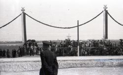Negatyw fotografii z wizyty marszałka Rydza Śmigłego w Zamościu w lipcu 1938 roku. Widoczna część trybuny z gośćmi i policjant pilnujący porządku. W tle panorama Zamościa. |