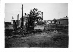 Fotografia przedstawia ruiny zabudowań, prawdopodobnie niewielkiego miasteczka. Fotografia wykonana we wschodniej Polsce lub na Kresach w latach 1941-42. Na odwrotnej stronie fotografii odręczny napis w języku niemieckim: Zniszczona wieś.