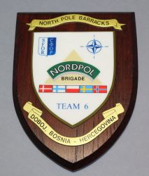 Drewniana tabliczka pamiątkowa dla członków brygady NORDPOL SFOR sił pokojowych ONZ w Bośni. |